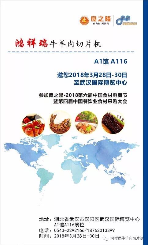 鴻祥瑞牛羊肉切片機(jī)廠家誠(chéng)邀您于2018年3月28日參加良之隆-2018第六屆中國(guó)食材電商節(jié)暨第四屆中國(guó)餐飲業(yè)食材采購(gòu)大會(huì)!