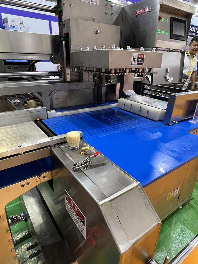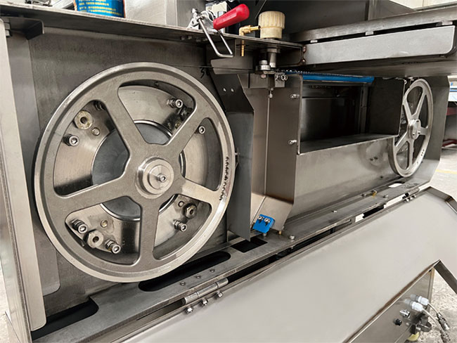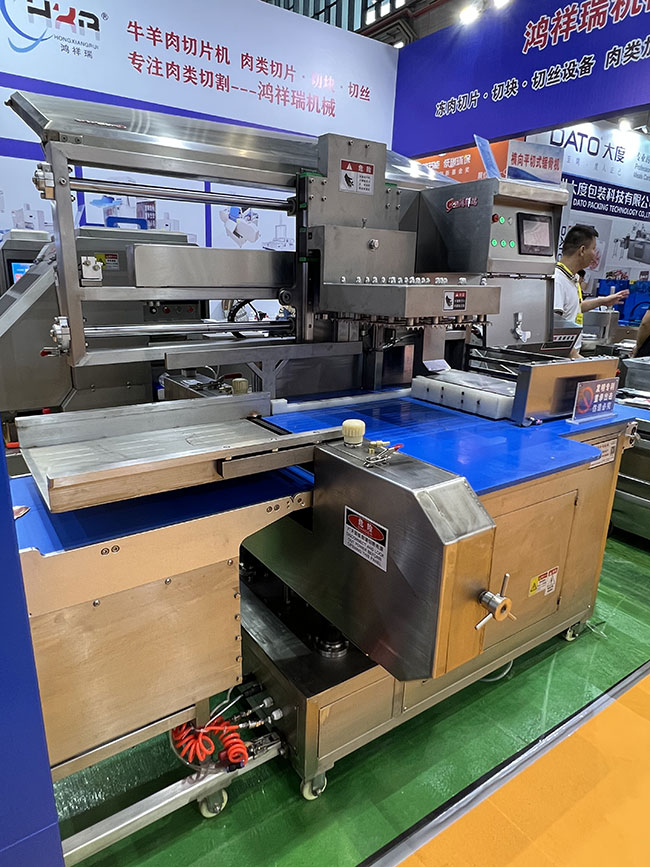 橫向平切式凍肉(骨)開片機,是我公司按照市場需求精心研發(fā)的一款骨肉類深加工切割設(shè)備。本設(shè)備已榮獲國家發(fā)明專利(專利號:202310105353)。本設(shè)備采用鋸切的方式和橫向結(jié)構(gòu),可以將﹣20℃的凍肉、骨等食材鋸切成為均勻平直且最大橫截面的片,可以極大提高后續(xù)切塊、切絲、切片等工序的成品率和成型率。本設(shè)備采用氣電組合的動力結(jié)構(gòu),整機設(shè)備由主機和氣動升降夾料輸送帶組成,放入食材原料后無需人工干預(yù),氣動壓料,自動往復(fù)鋸切傳輸,極大提高了工作效率,保證了工作人員的安全性。開片厚度可以根據(jù)用戶需求數(shù)控調(diào)節(jié),方便快捷。整機采用SUS304不銹鋼材質(zhì),工作完成后可用高壓水槍直接沖洗和消毒處理。本設(shè)備適合用于超低溫凍肉、骨類切割,例如:冷凍大塊部位牛肉、大塊部位豬肉、調(diào)理組合禽類、脊骨、扇子骨、冷凍鱈魚等硬質(zhì)食材的橫向開片。外觀美觀大氣,是食品加工企業(yè)及食品深加工車間的優(yōu)秀選擇!